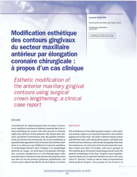 Modification Esthétique des Contours Gingivaux du Secteur Maxillaire Antérieur par Elongation Coronaire Chirurgicale : à propos d’un Cas Clinique.